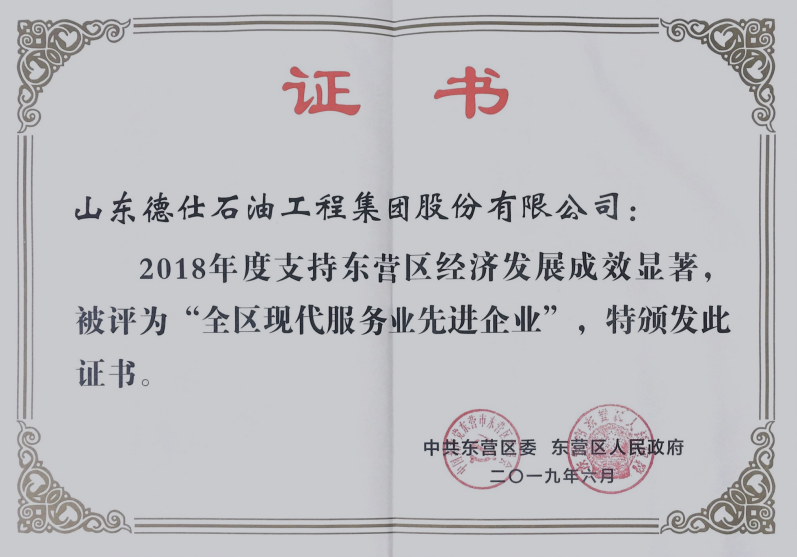山东德仕石油工程集团股份有限公司荣获“东营区现代服务业先进企业”荣誉称号。
