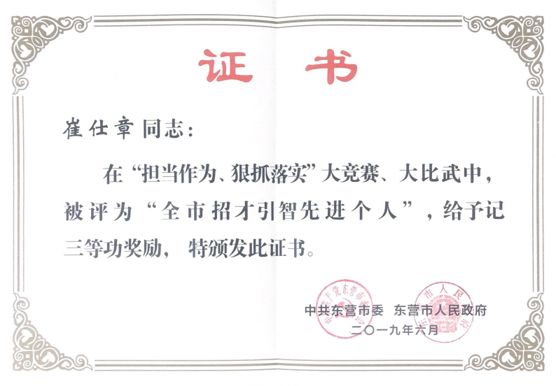 德仕集团董事长崔仕章荣获“东营市招才引智先进个人”荣誉称号。