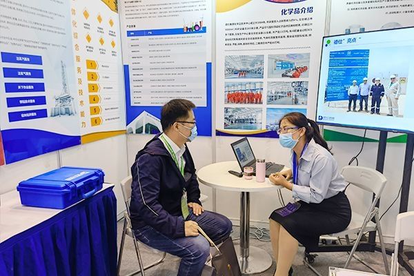 德仕能源科技集团作为中石化主要供应商之一,携众多“明星产品”及创新技术受邀参加本次展会。以油田专用化学品为主,德仕集团进行了样品展示和现场业务讲解,活动当天即吸引了五十多家采购商的咨询与洽谈。现场工程师和销售人员将采出液处理化学剂、污水处理化学剂、井筒及管道化学剂、提高采收率化学剂和油层改造化学剂的产品用途、特点和优势进行了详细讲解。