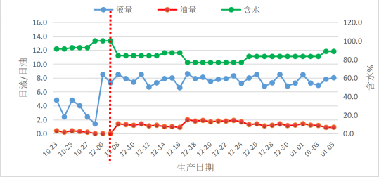 通过上述图表生产数据可知:针对于吉林某区块原油,加入油溶水分散性降粘剂可以显著提升产液量和产油量。